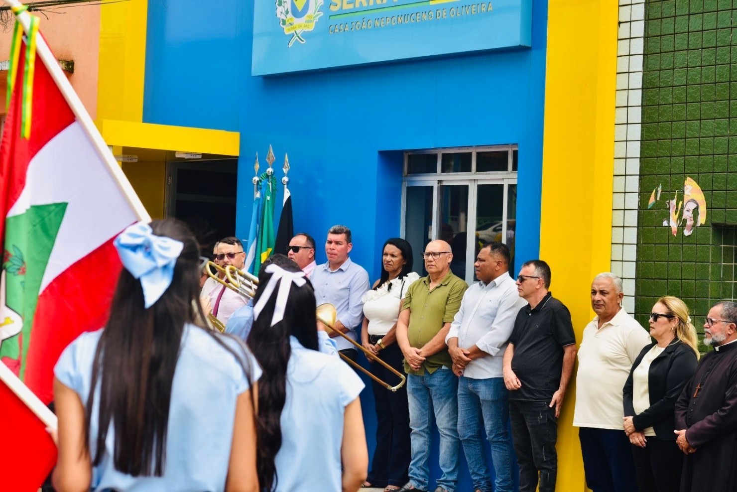 O presidente Paulo Cesar ao lado dos colegas parlamentares estiverem presentes e acompanharam o hasteamento nas escolas, secretaria de educação, prefeitura e no prédio da câmara.